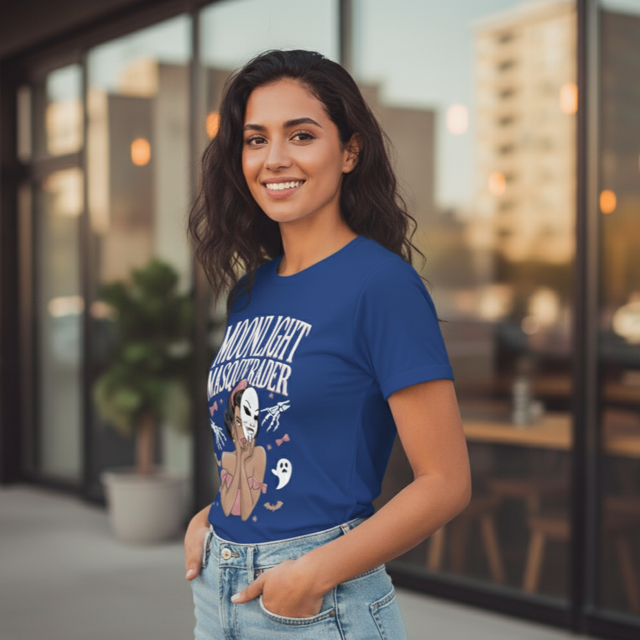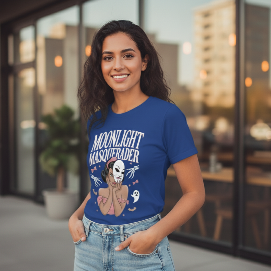 Designed for women who love unique statement fashion, this vintage-inspired gothic tee combines retro elegance with a modern streetwear vibe. The eye-catching artwork features a mysterious masquerade queen, playful ghost accents, and bold lettering – making it a perfect pick for parties, college looks, or casual everyday wear.